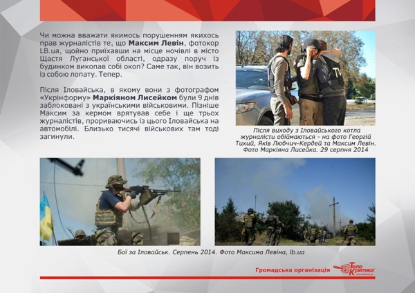 Чи можна вважати якимось порушенням якихось прав журналістів те, що Максим Левін, фотокор LB.ua, щойно приїхавши на місце ночівлі в місто Щастя Луганської області, одразу поруч із будинком викопав собі окоп? Саме так, він возить із собою лопату. Тепер. Після Іловайська, в якому вони з фотографом «Укрінформу» Маркіяном Лисейком були 9 днів заблоковані з українськими військовими. Пізніше Максим за кермом врятував себе і ще трьох журналістів, прориваючись із цього Іловайська на автомобілі. Близько тисячі військових там тоді загинули.