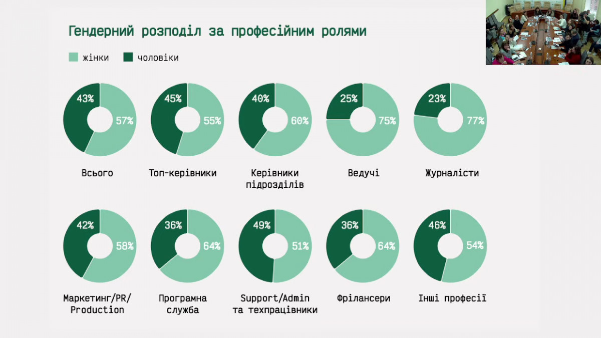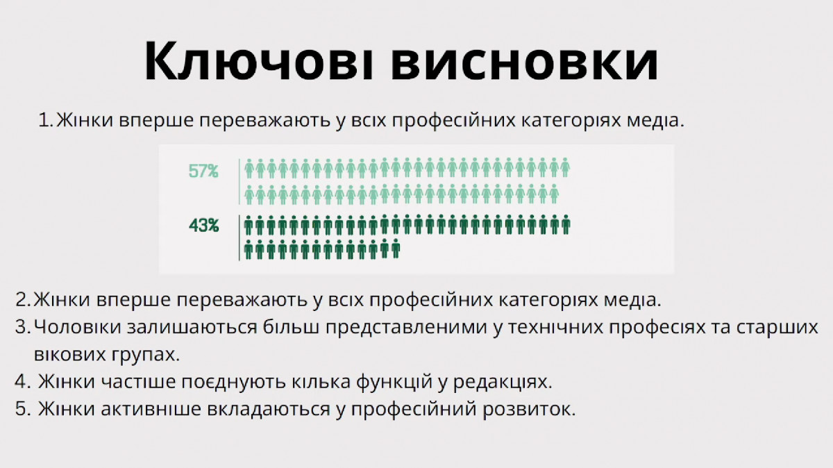 Зоя Красовська повідомила, що протягом останніх трьох років критичної зміни в показниках не спостерігалося. Однак ключовий висновок цього року — вперше жінки переважають в абсолютно всіх професійних категоріях в медіа. у 2025 році серед працівників редакцій жінки становлять 57%, а чоловіки — 43%.