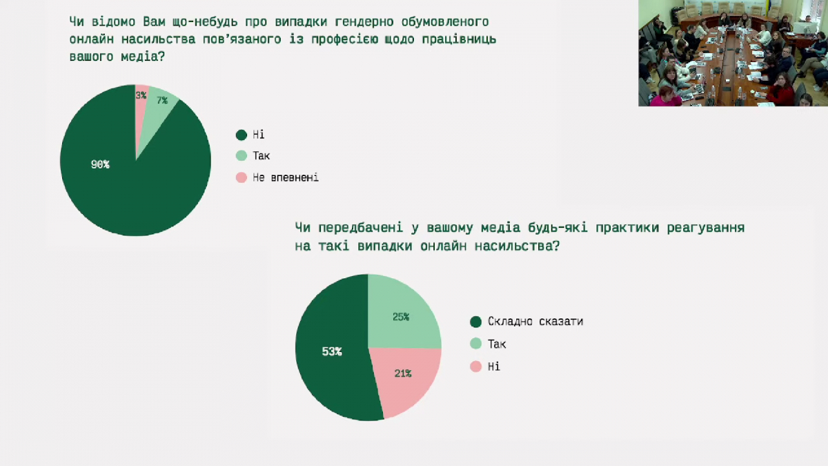 Голова ГО «Жінки в медіа» Ліза Кузьменко зауважила, що цьогоріч був включений блок, який стосувався технологічно-зумовленого гендерного насильства. 90% редакцій відповіли, що вони не стикалися з практиками онлайн-насильства щодо жінок в своїх редакціях. Дослідниці припускають, що в редакціях просто не вистачає або довіри всередині колективу, коли жінки можуть повідомити редакції про такі випадки, або інструментів, щоб ідентифікувати, що є формами насильства.