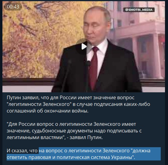 І ось вже Путін визнав: «Для Росії питання про легітимність Зеленського має значення, доленосні документи треба підписувати з легітимною владою».