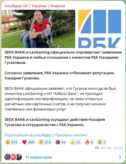 «Зокрема, за участі компаній IBOX BANK і LeoGaming поширюються фейки про нібито відбілювання репутації Гусакова нашою редакцією, що не має нічого спільного з редакційною діяльністю РБК-Україна», — йдеться у повідомленні медіа.
