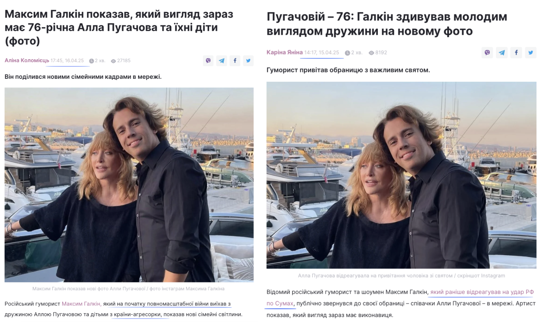 Крім того, редакція УНІАН на початку тексту акцентувала на підтримці України й тому, що Галкін відреагував на удар росіян по Сумах, хоча дві новини стосувались іншої теми та були присвячені Пугачовій, її сімʼї та зовнішньому вигляду артистки.