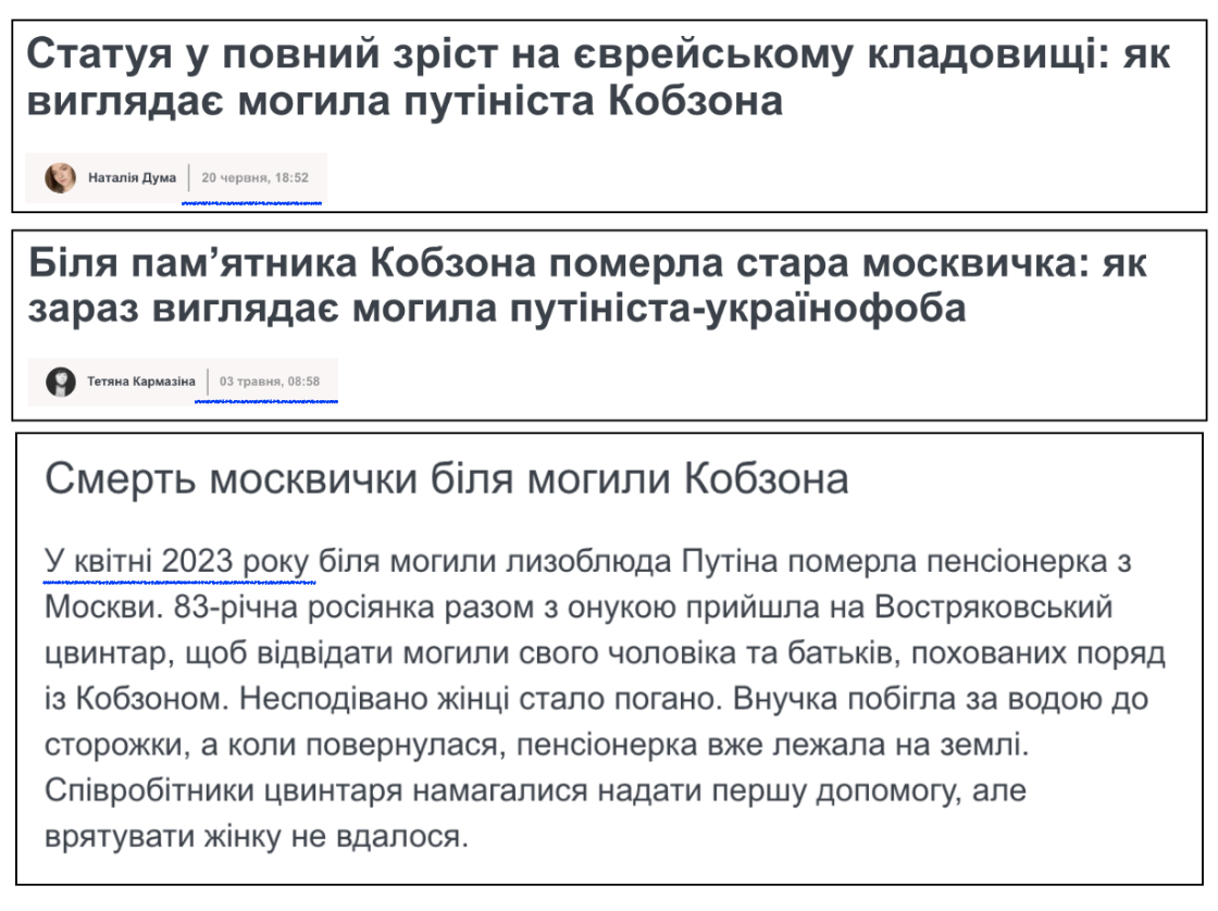 Водночас другому матеріалу про те, що начебто біля пам'ятника Кобзону померла старша жінка, передував огляд могильної плити Кобзона, і лише в останньому абзаці згадувалося, що неподалік померла росіянка. Щоправда, це сталося ще у квітні 2023-го.
