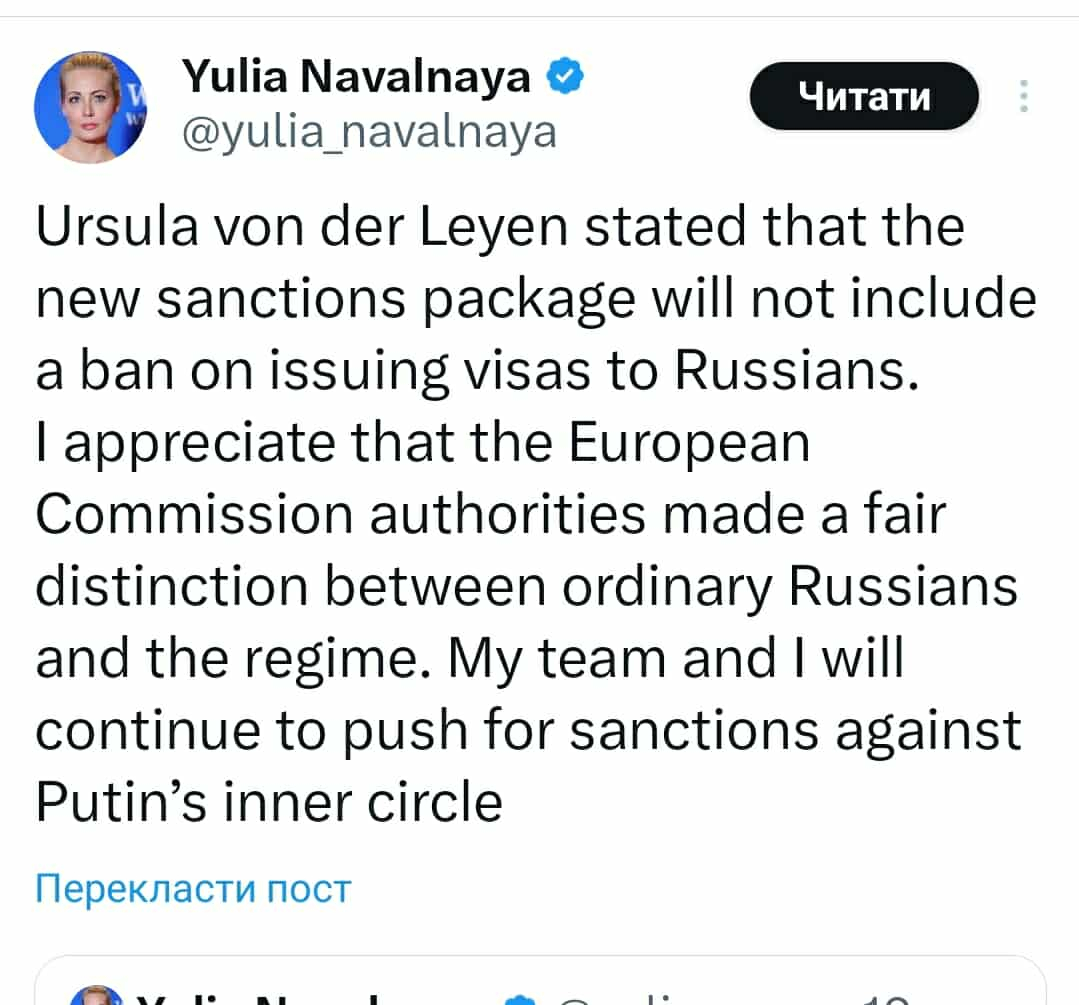 І, зрозуміло, що війна в Україні – це теж тільки Путін та його «оточення», а не російське суспільство. Так, Навальная наголошує, що Путіна і росіян потрібно розділяти, бо «справжня Росія» на її думку, «проти війни». Або ж у дописі, де Навальна реагує на події на Курщині, читаємо: