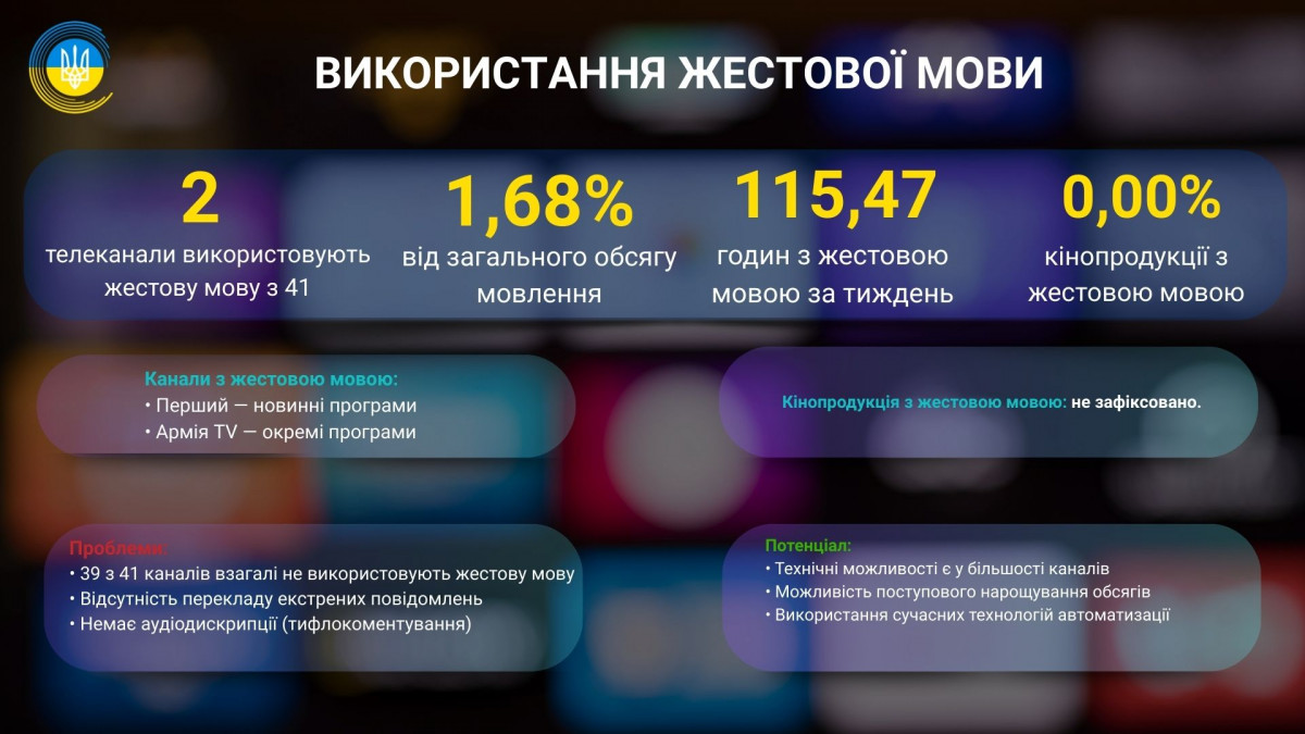 Сьогодні, 23 вересня, у Міжнародний день жестових мов, Національна рада України з питань телебачення і радіомовлення презентувала результати моніторингу 41 загальнонаціонального телеканалу щодо інклюзивної доступності їхнього контенту. Дослідження показало, що лише 2,3% ефірного часу супроводжується перекладом жестовою мовою, а частка доступної кінопродукції становить 0%.