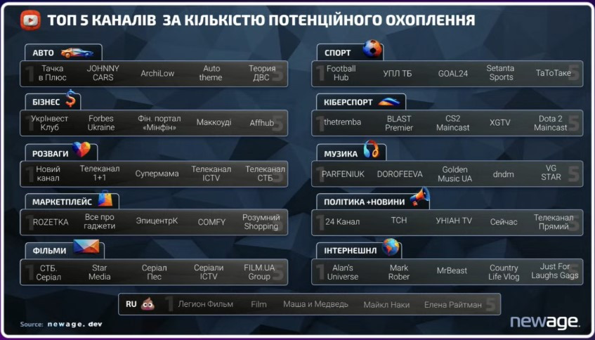 Нагадаємо, за даними дослідження Newage, YouTube та Telegram є лідерами за рівнем охоплення української аудиторії.