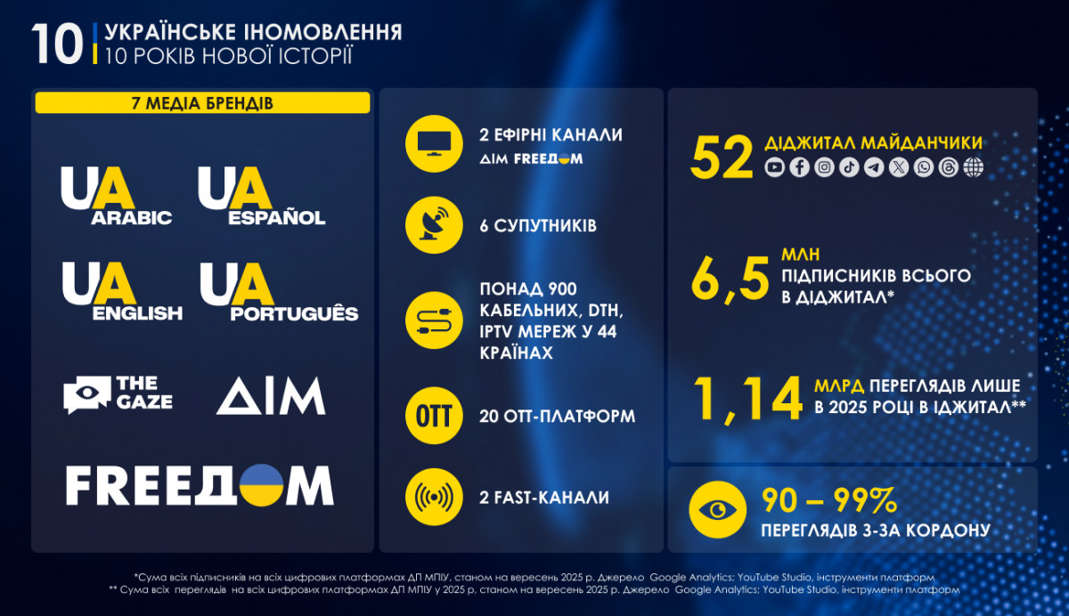 Нині ефірні телеканали транслюють контент через 6 супутників, мережі національних кабельних, DTH та IPTV операторів в 44 країнах світу та на 20 міжнародних ОТТ-платформах. Цифрова екосистема іномовлення нараховує 6,5 млн підписників (сума підписників на ютубі, у фейсбуці, тіктоці, телеграмі, іксі та вотсапі станом на 30 вересня цього року).