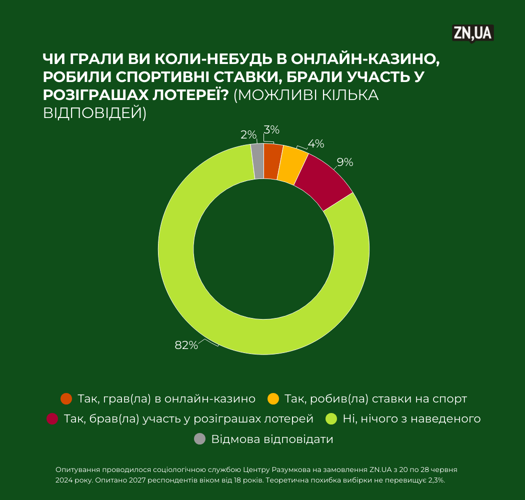 Однак, згідно з результатами соціологічного дослідження, проведеного на замовлення ZN.UA Центром Разумкова до цієї легалізації, 8,5% українців сказали, що грали в онлайн-казино чи робили ставки на спорт. Соціологи запитали респондентів: «Чи грали ви колись в онлайн-казино, робили спортивні ставки, брали участь у розіграшах лотереї?». 85% відповіли, що не мають до того всього жодного відношення, 8,5% сказали «так».