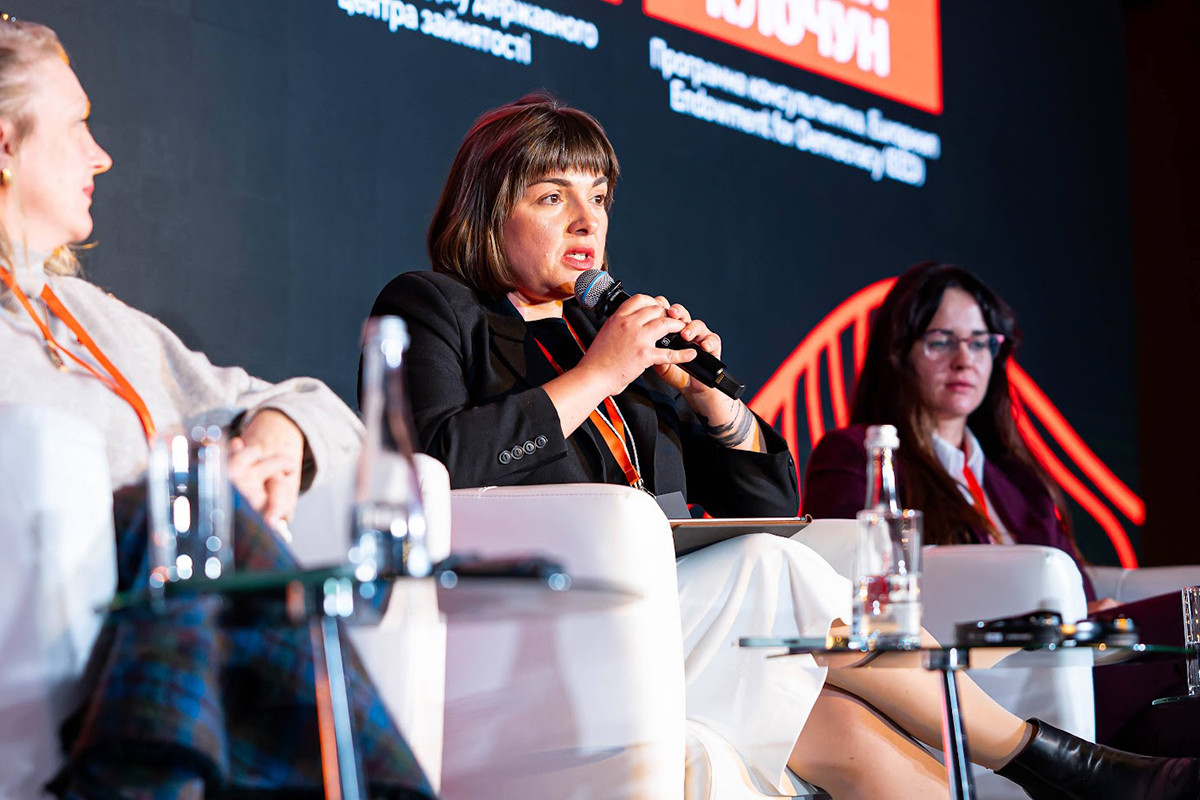 Модераторка представила Марію Іщенко, додавши, що, можливо, для когось дивно бачити представницю Центру зайнятості серед учасників панелі, але багато хто може не знати про програму «Грант на власну справу». Саме про неї йшлося далі, адже нещодавно вона почала активніше підтримувати креативні індустрії та медіа.