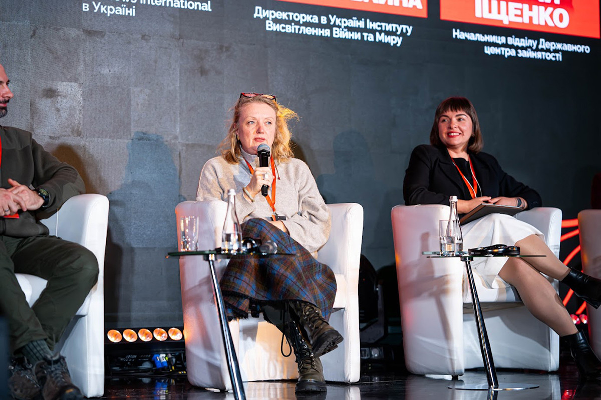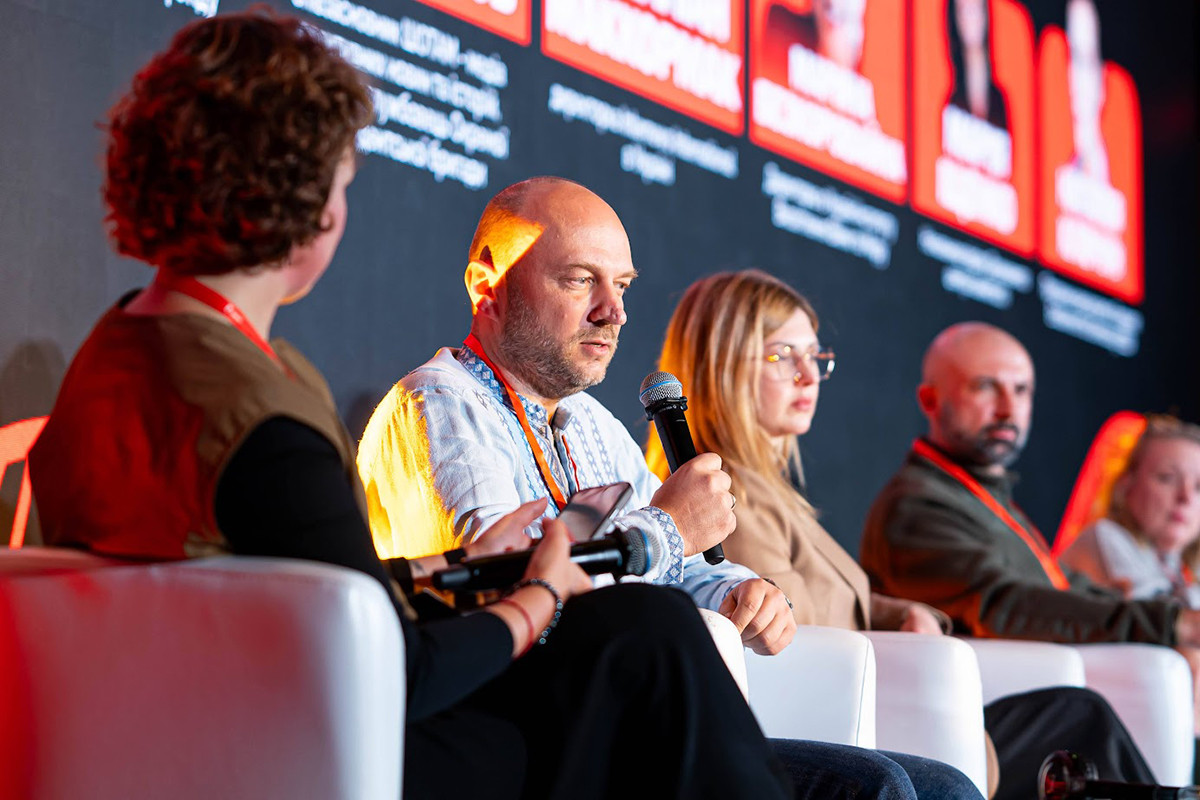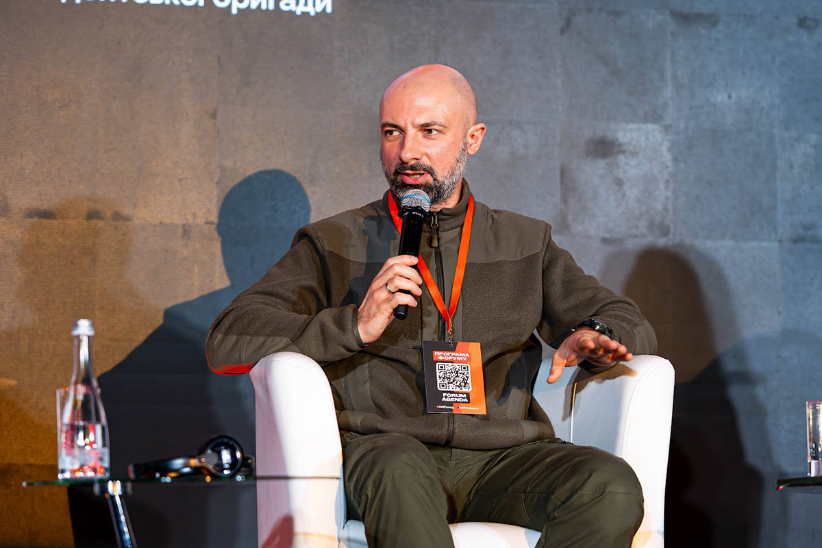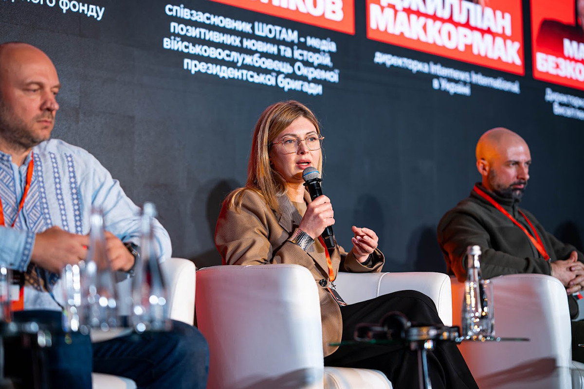 Віра Костенко-Кузнєцова перейшла до розмови з єдиним представником медіа на панелі — Сергієм Колесніковим, співзасновником «ШоТам», а також військовослужбовцем Окремої президентської бригади.