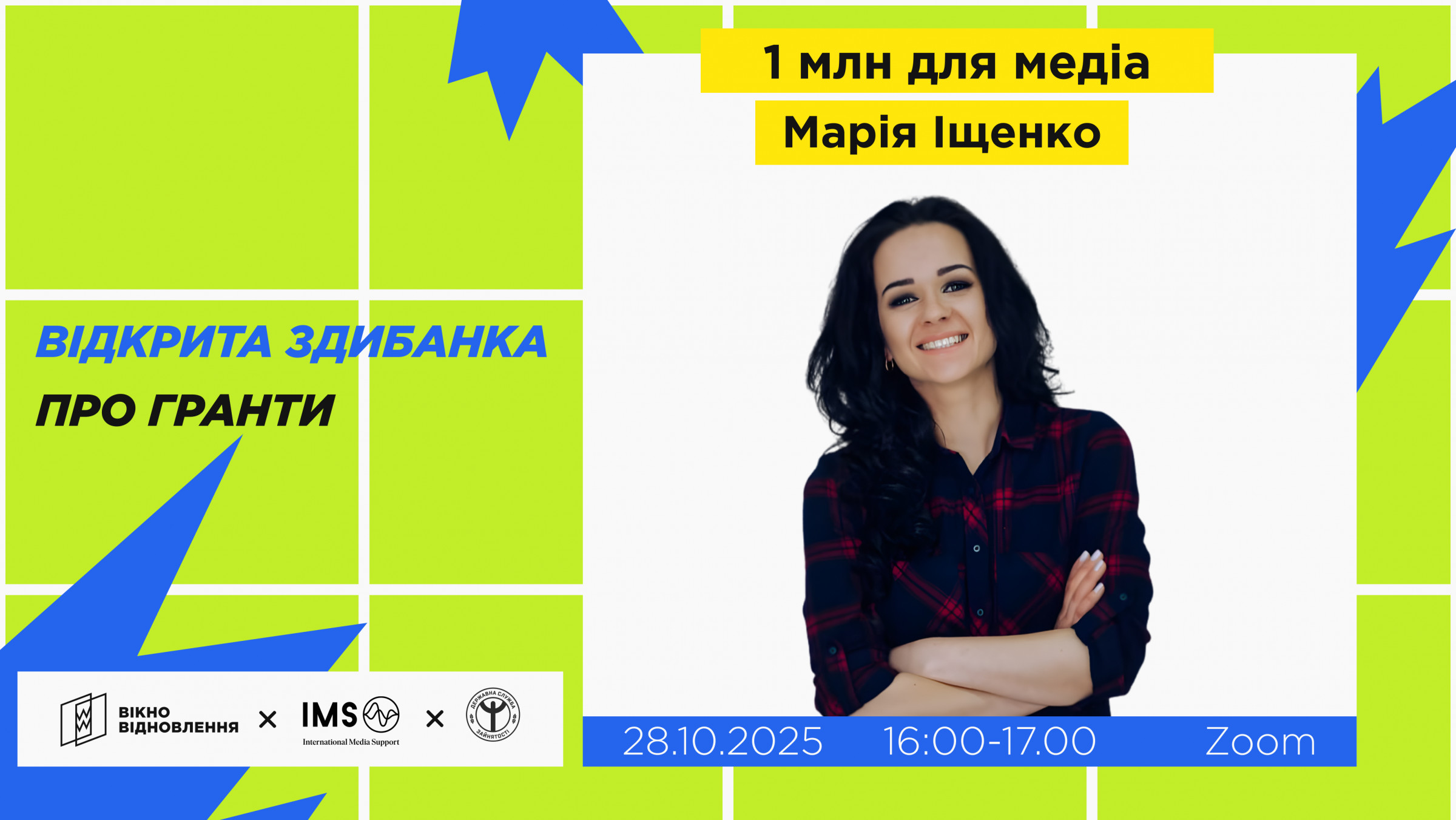 Спікеркою здибанки стане Марія Іщенко, начальниця організаційно-мотодологічного відділу супроводження реалізації проєктів фінансового управління Фінансового департаменту Державного центру зайнятості. Вона розповість, як Державна служба зайнятості сприяє створенню нових робочих місць через програму «Власна справа»: