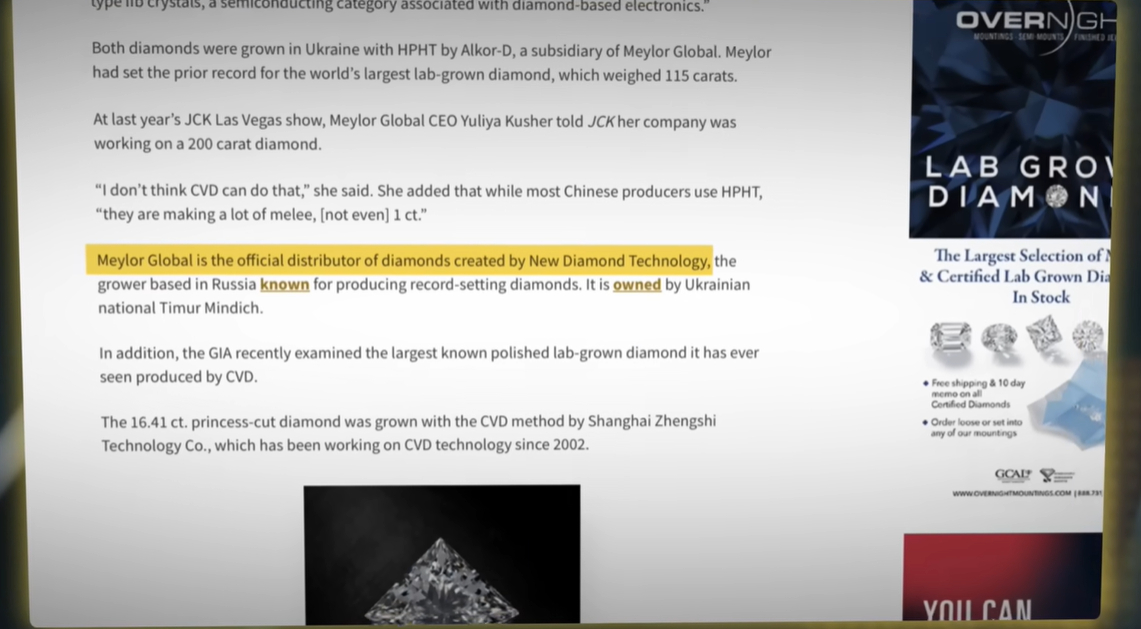 До того ж, за даними Ярослава Железняка, британська компанія Міндіча Meylor Global, яка позиціонувала себе як дистриб'ютор української лабораторії Alkor-D та партнер заводу «Ізумруд», щонайменше до 2022 року була дистриб'ютором діамантів російської New Diamond Technology.