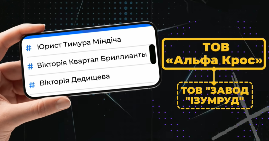 Натомість власником заводу стало ТОВ «Альфа Крос». Утім, як зауважив Железняк, у телефонних базах його голова Вікторія Дедіщева часто записана як юристка Міндіча та «Вікторія Квартал Діаманти».