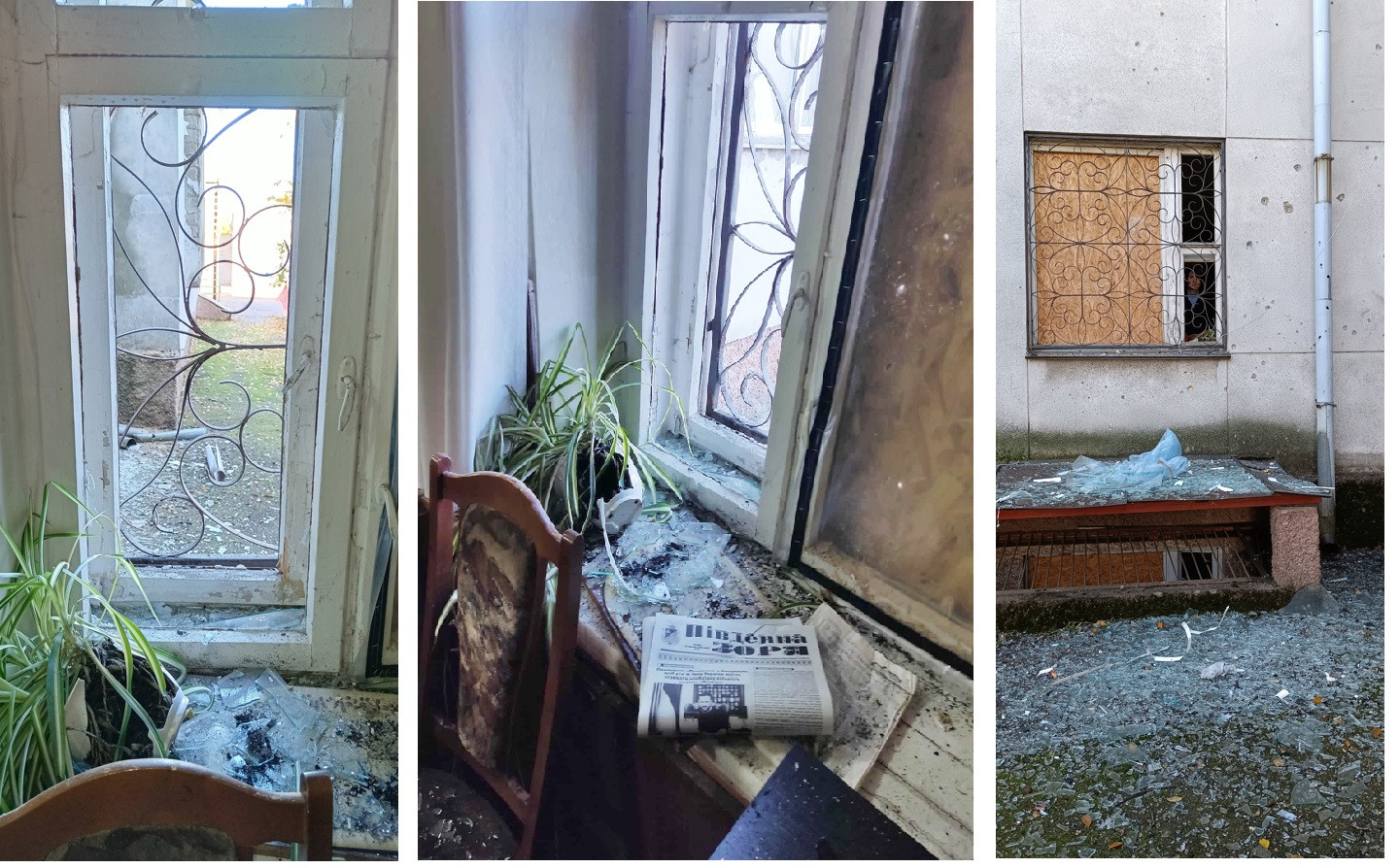 «Знову, як і в 2022-му, постраждало єдине вікно у нашому кабінеті. Цей FPV-дрон влучив в кут будівлі, якраз з нашого боку. Причому дуже дивне начиння боєпрису — пробило скло, плівку та ОСБ-панелі, частково ушкодило внутрішні двері в коридор та меблі. І, головне, перелетіло все і розірвалося вже в коридорі. Там видно більші руйнування. Це, скоріше за все, якийсь новий вид боєприпасів, він “летить” не так, як звичайний осколок», — сказала Швидка.