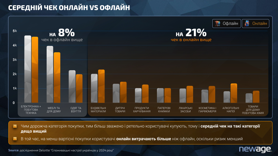 Онлайн-покупці витрачають більше. Середній чек онлайн становить 1890 грн, що на 6% перевищує офлайн (1790 грн).