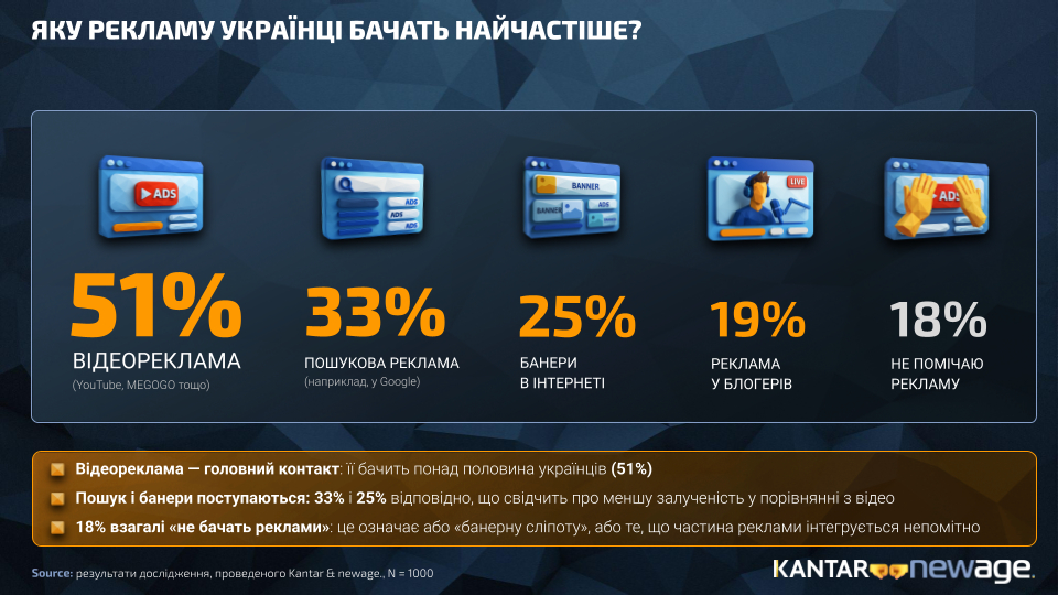 Для української аудиторії відео стало основним способом сприйняття інформації. Понад 51% респондентів відповіли, що найчастіше стикаються саме з відеорекламою — зокрема, на YouTube, Megogo й інших платформах. Це підтверджує тренд на візуалізацію комунікацій: користувачі все менше читають тексти та дедалі частіше обирають короткі, динамічні формати, які легко споживати на мобільних пристроях.