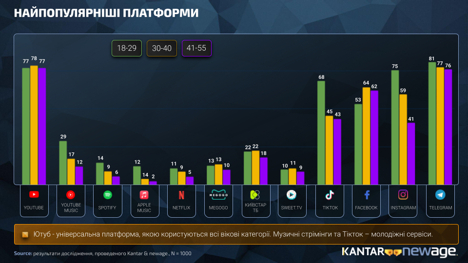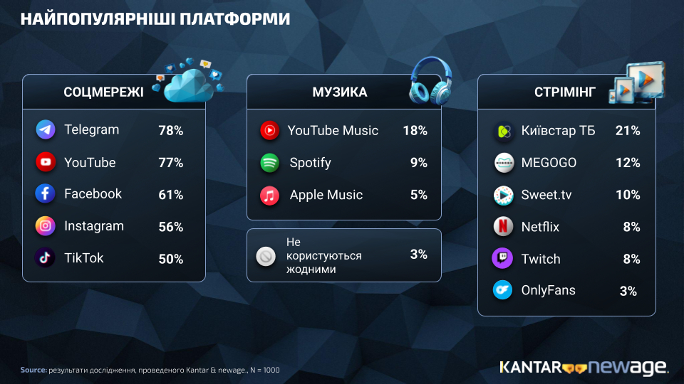 Далі — Facebook (61%), Instagram (56%), TikTok (50%). Музику найчастіше слухають на YouTube Music, далі — Spotify і Apple Music. Для відео- та телеконтенту — «Київстар ТБ», Megogo, Netflix.