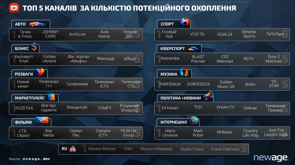 За результатами аудиту, ядро YouTube формують новини, політика та розваги — саме ці напрямки генерують найбільше потенційне охоплення.