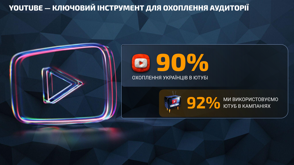 YouTube є беззаперечним лідером українського диджитал-простору. Його охоплення сягає 90% усіх інтернет-користувачів, і 92% кампаній, які запускають бренди в Україні, вже включають YouTube як обов’язковий елемент медіаплану.