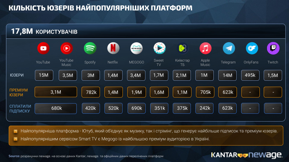 У рейтингу найпопулярніших сервісів за кількістю платних користувачів лідирує YouTube Premium (3,1 млн користувачів) — платформа, що поєднує відео, музику та стримінг.