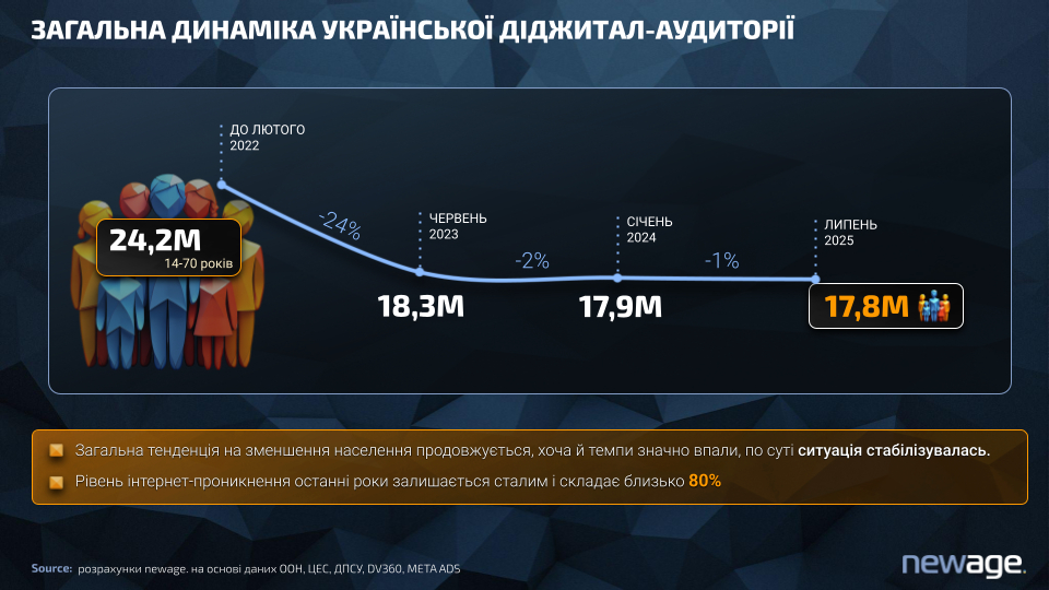 На 2025 рік в Україні налічується 17,8 мільйона користувачів віком 14—70 років, які активно користуються інтернетом. Якщо додати дітей молодших 14 років і старших за 70, загальна аудиторія сягає понад 21 мільйона.