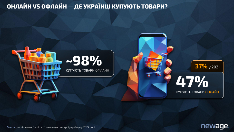 Майже половина респондентів (47%) стабільно купують онлайн, тоді як у 2021-му таких було 37%. Водночас 98% усе ще роблять покупки офлайн — тобто дві реальності співіснують.