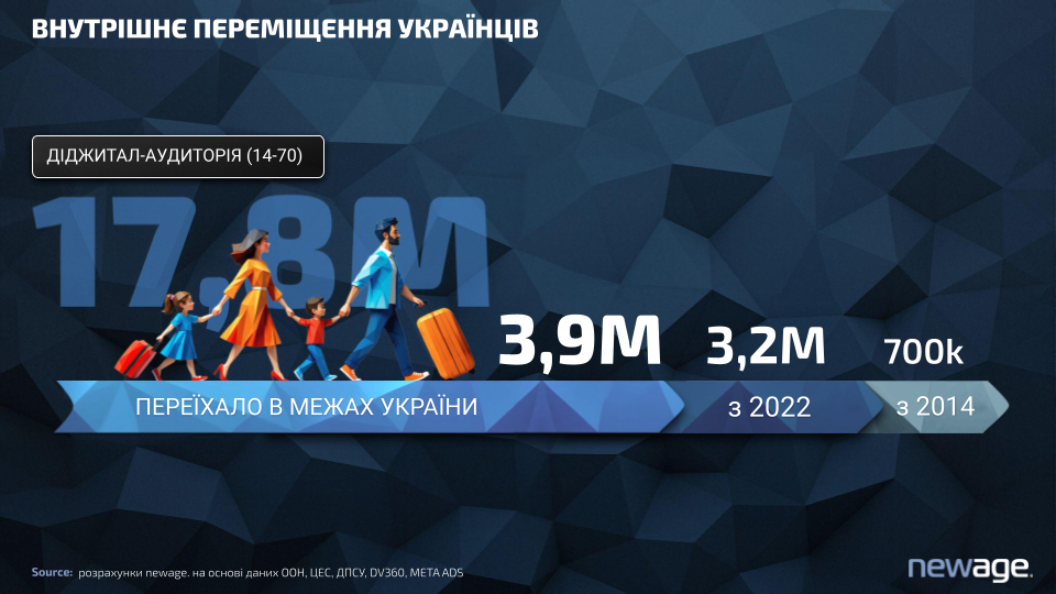 Водночас 3,9 мільйона українців змінили місце проживання всередині країни. Це величезний обсяг внутрішньої мобільності, який вплинув на структуру диджитал-аудиторії — зокрема, на те, де тепер зосереджено користувачів із високим рівнем онлайн-активності.