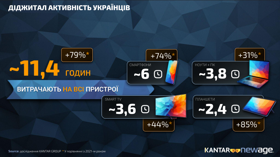 Більшість часу користувачі приділяють смартфону — близько 6 годин, ще 3,6 години — Smart TV, а також працюють із ноутбуками, планшетами й ПК.