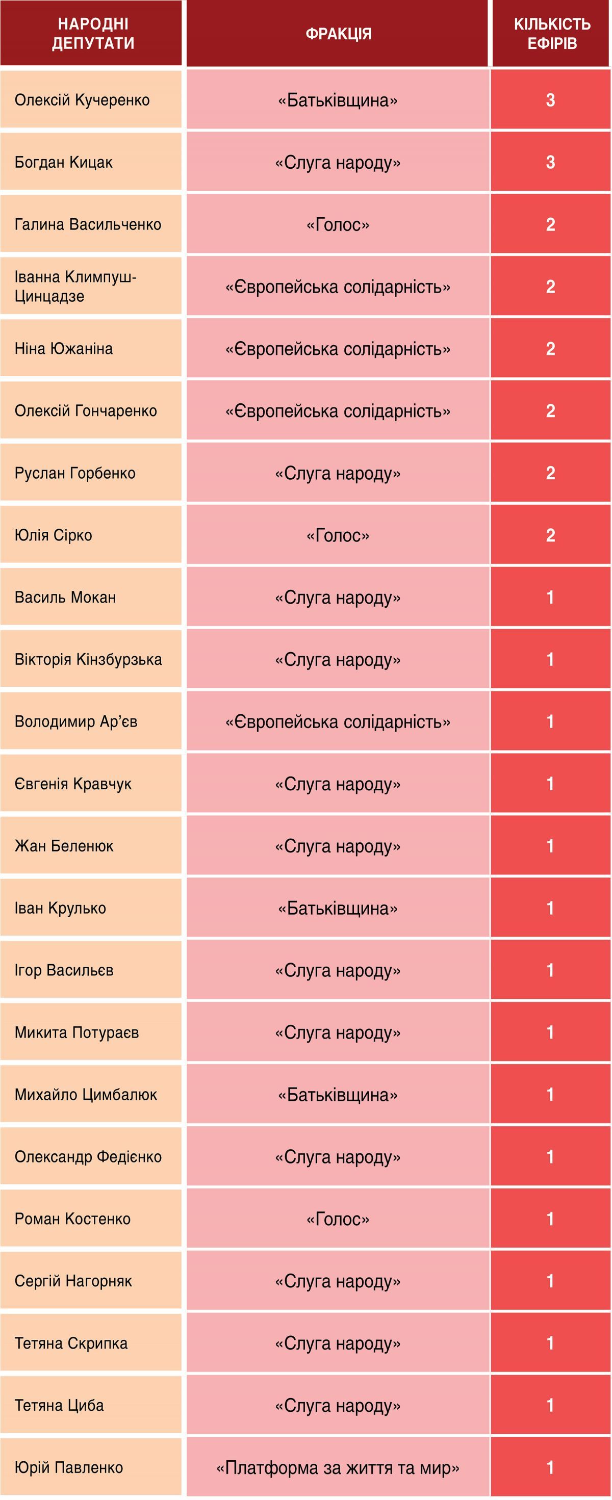 Серед усі нардепів «найпопулярнішими» гостями на каналі були Олексій Кучеренко з «Батьківщини» і Богдан Кицак, які побували в ефірі тричі. По два рази гостювали на каналі Руслан Горбенко зі «Слуги народу», Галина Васильченко і Юлія Сірко з «Голосу», Іванна Климпуш-Цинцадзе, Ніна Южаніна й Олексій Гончаренко з «Європейської солідарності». Всі інші нардепи були на каналі по одному разу.