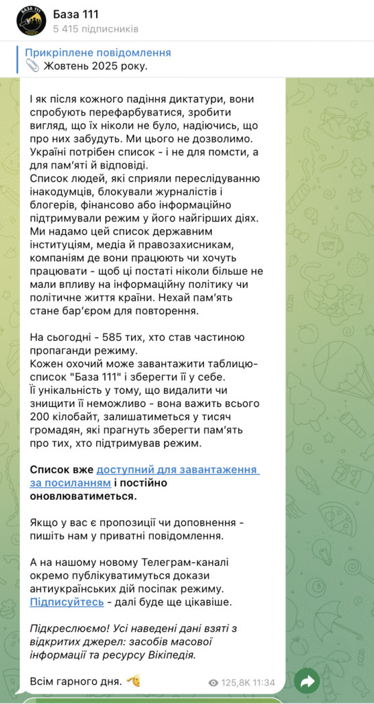 2 жовтня 2025 року в телеграм-каналі «База 111», який модерується невідомими особами, було опубліковано прикріплений файл із назвою «База_111_Список_пропагандистів_режиму_Зеленського». Це таблиця у форматі pdf, де зібрано сотні прізвищ українських громадських діячів та діячок, медійниць та медійників, політиків і політикинь, військових тощо. Їх називають «прибічниками режиму Зеленського», «пропагандистами» та звинувачують у «публічній підтримці президента Зеленського». Прізвища та імена підкріплені посадами, навпроти деяких з них також зазначено дати народження.