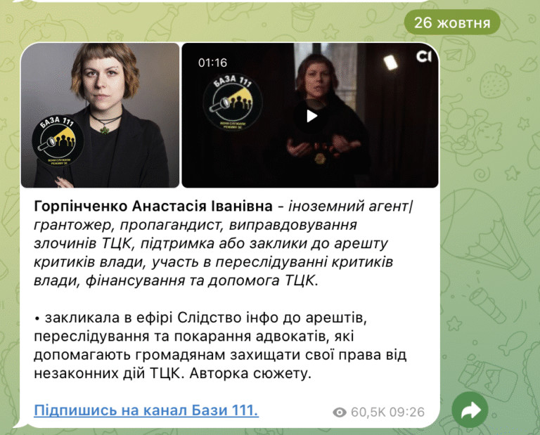 «Видала матеріал «Слідство інфо» з закликом карати адвокатів, які допомагають українцям захищати свої права від незаконних дій ТЦК. при тому, що ні екс-чоловік, ні теперішній чоловік не служать на фронті».