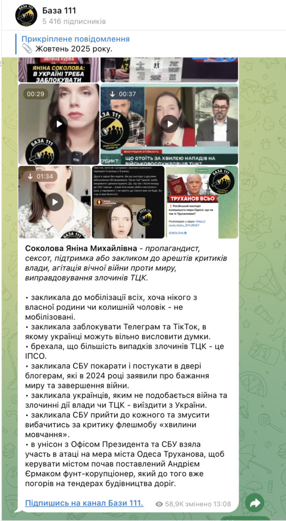 Окремо згадують у телеграм-каналі «База 111» також ведучу авторського YouTube-проєкту Яніну Соколову. Її називають «пропагандист, сексот, підтримка або закликом до арештів критиків влади, агітація вічної війни проти миру, виправдовування злочинів ТЦК».