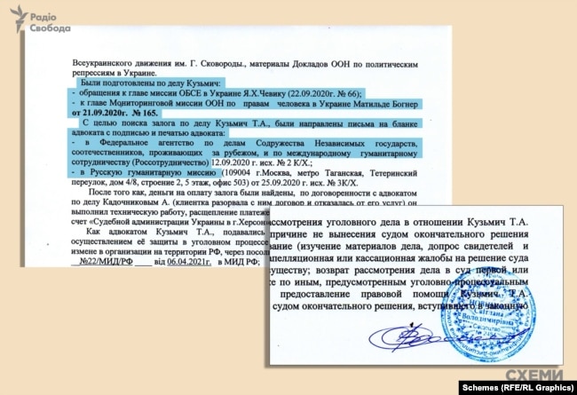 У витоку є і звіт адвокатки, у ньому – про вивчені сторінки у справі, звернення до ОБСЄ, ООН та до російських міністерств. Окремий пункт – пошук грошей на заставу для підозрюваної Кузьміч. З проханням про це Новицька зверталася до російського агентства та гуманітарної місії РФ. На документі є підпис та печатка адвокатки. Вона усе заперечує.