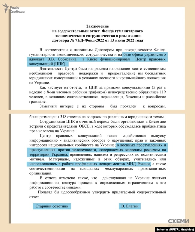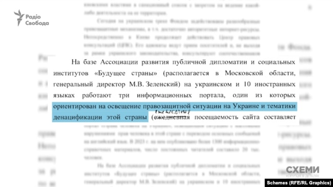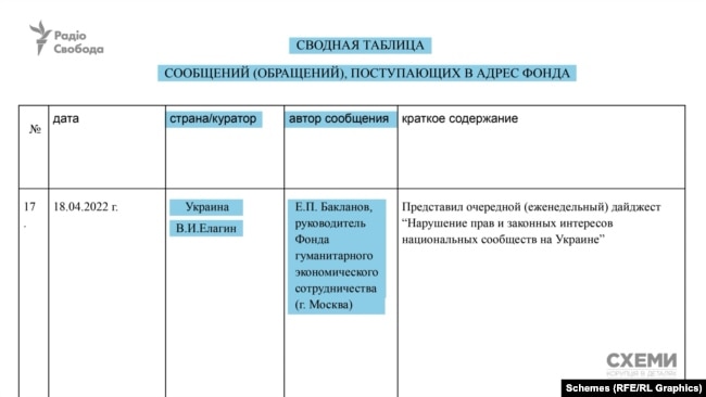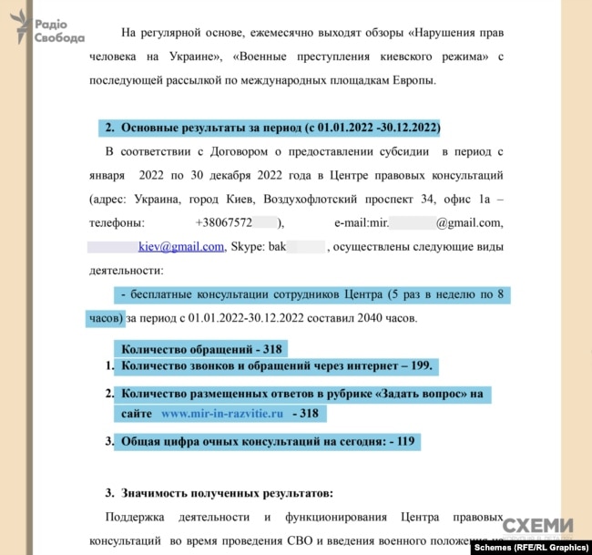 У звіті фонду про його роботу, який «Схеми» розшукали у витоку, є розділ – «Український напрямок». У ньому детально описується робота, яку «Правфонд» веде на території України. Наприклад, функціонування в Києві «Центру правових консультацій», адвокати якого вели прийом громадян, а сам центр готував звіти для російської влади про «воєнні злочини ЗСУ» та «порушення прав російськомовного населення».