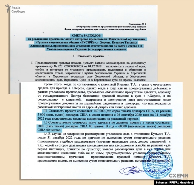 У витоку є кошторис адвокатки Новицької для захисту обвинуваченої у держзраді Кузьміч. Вартість адвокатських послуг – 140 тисяч доларів США, по п'ять тисяч доларів на місяць з 2020-го до 2022 року.