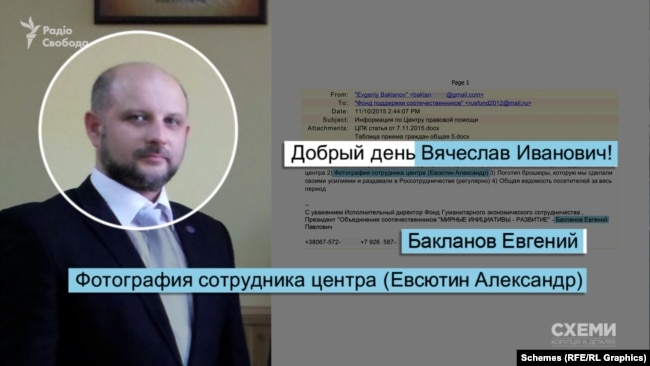 У витоку є фото за 2015 рік із відкриття у Києві «Центру правових консультацій». На світлині Бакланов із групою людей. Це фото і звіт до нього Бакланов надіслав «Правфонду» в Москву, підписавшись у листі як «Президент організації «Мирні ініціативи: Розвиток».