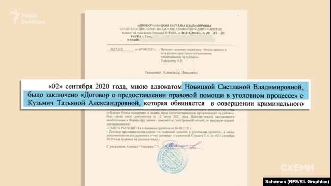 Зокрема, серед документів є лист до цього фонду на бланку з написом «адвокат Світлана Новицька». У ньому йдеться про те, що у 2020-му ця адвокатка підписала угоду про захист Тетяни Кузьміч – обвинуваченої у державній зраді у Херсоні. За даними СБУ, під її керівництвом у Херсонські області діяла агентурна мережа ФСБ.