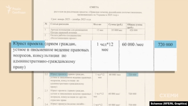 Юристи у цьому проєкті мали отримати по 720 тисяч рублів (зараз це 8800 доларів). Це оплата за аналітику для депутатів Держдуми і Міністерства закордонних справ РФ.