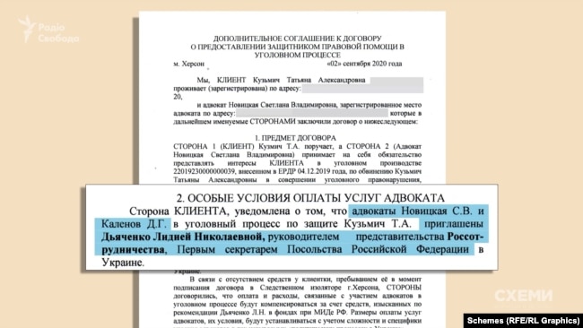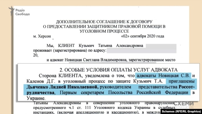 Є інший документ – угода Новицької з обвинуваченою Кузьміч. Тут згадка, що адвокатку запросила Лідія Дьяченко – перша секретарка російського посольства в Україні, представниця «Россотрудничества».