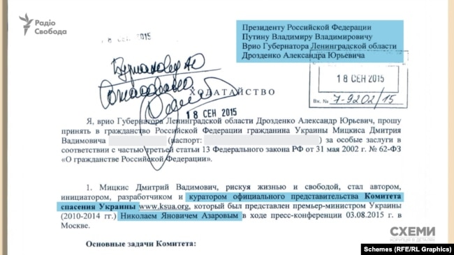 У листі губернатор Ленінградської області просить Путіна про громадянство Росії для Дмитра Міцкіса. Міцкіс тут згадується куратором «Комітету порятунку України», організованого експрем'єр-міністром України Миколою Азаровим.