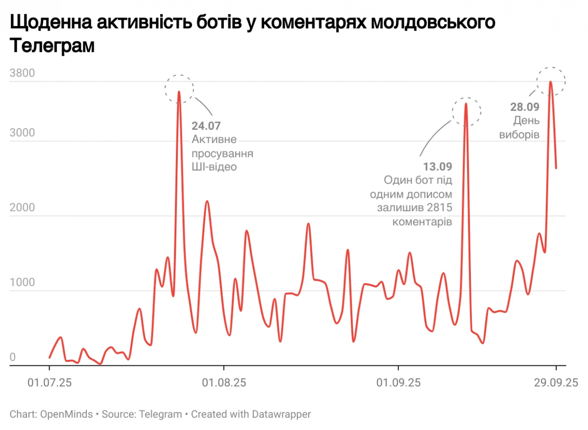 Напередодні парламентських виборів у Молдові 28 вересня цього року та сама ботоферма "зайшла" в молдовський Telegram. Як наслідок – за 4 місяці до голосування кожен восьмий коментар в місцевих суспільно-політичних каналах був згенерований ботом.