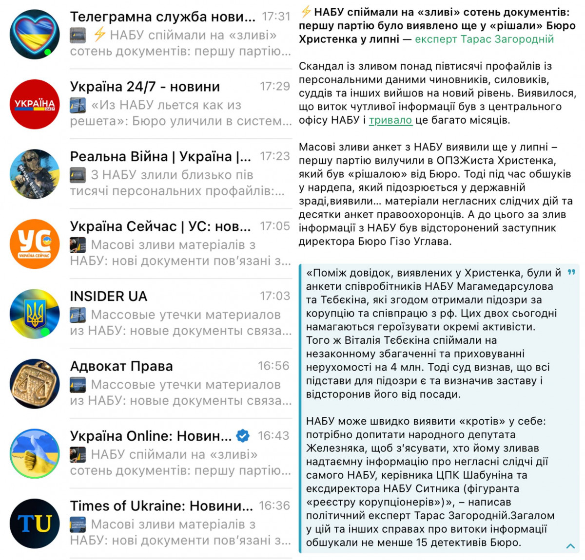 Усі з них опублікували схожий текст з посиланням на фейсбук-допис політтехнолога, партнера Національної антикризової групи Тараса Загороднього, в якому той написав, що «з НАБУ інформація тече як з решета» і 527 досьє на детективів, депутатів, чиновників, силовиків та журналістів, виявлених у бекофісі фігурантів справи про корупцію в енергетиці, могли «злити» «саме з Бюро».