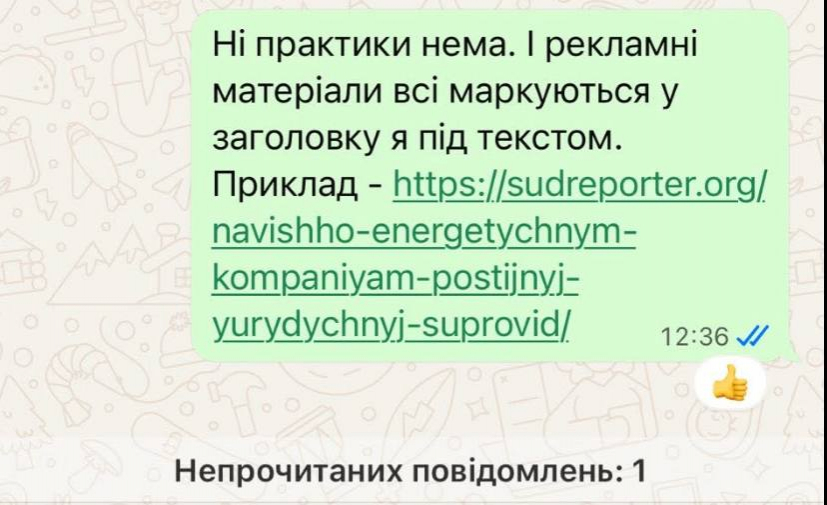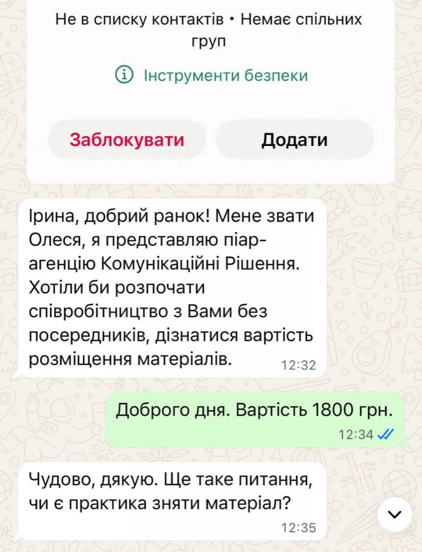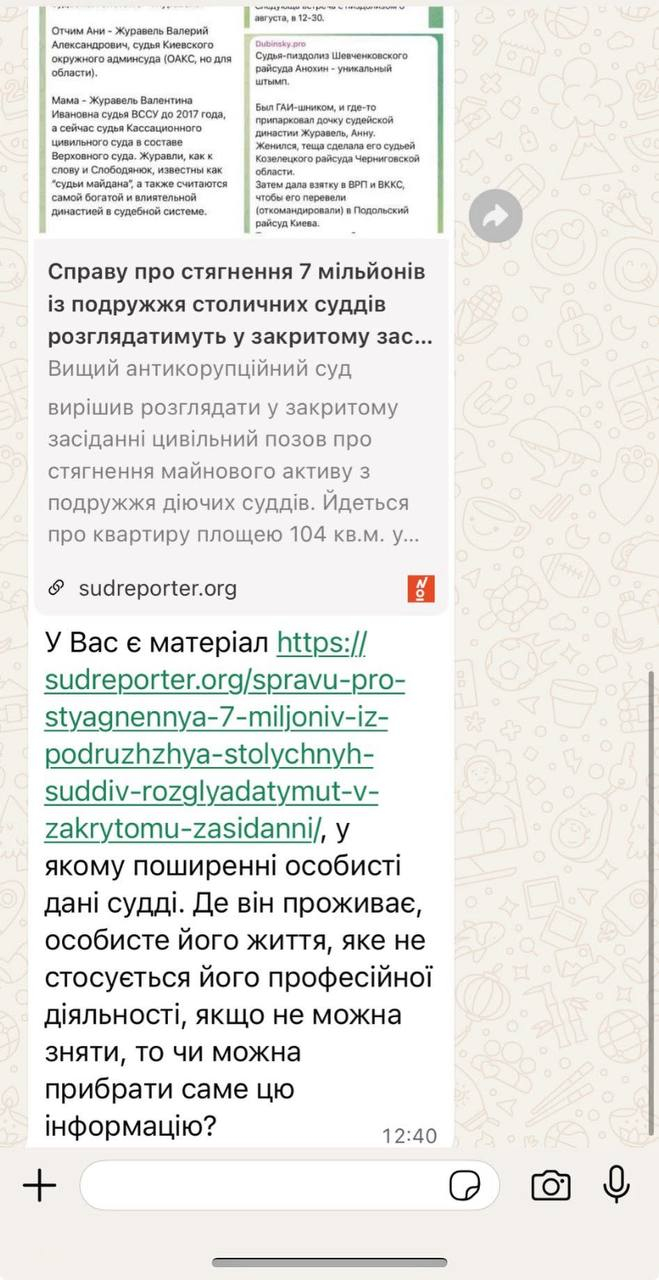 Головна редакторка видання «Судовий репортер» Ірина Салій отримала у вотсапі повідомлення із запитом за гроші видалити певну інформацію з матеріалу медіа. Вона оприлюднила скриншоти листування на своїй фейсбук-сторінці.