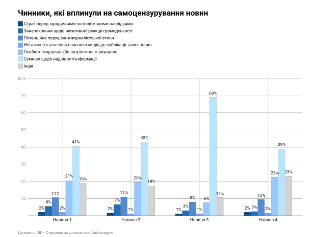 Основними чинниками, які впливали на рішення щодо публікації матеріалів, за самооцінкою респондентів, були особисті моральні або патріотичні міркування (від 7,5% до 22,5% залежно від новини) та сумніви щодо надійності інформації (від 39% до 69% залежно від сюжету).