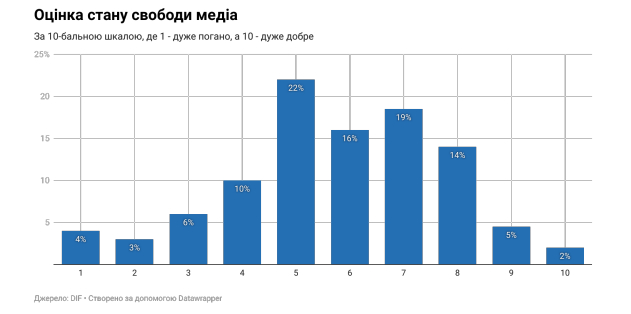 Згідно з результатами, в оцінках опитаних представників української медіаспільноти щодо поточного стану свободи медіа немає гомогенності. Середнє значення 5,8 бала за шкалою від 1 до 10 вказує на переважно нейтральне або помірно позитивне сприйняття стану свободи медіа в Україні. Більшість оцінок респондентів (56%) лежить у діапазоні між 5 та 7 балами.