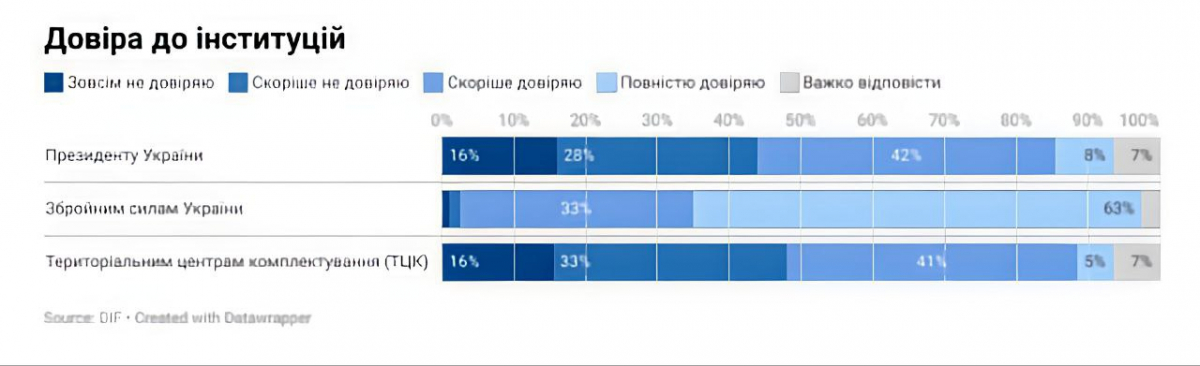Середнє значення довіри коливається від майже повної довіри до Збройних сил (3,6 бала за шкалою від 1 до 4) до переважаючої недовіри президенту (2,4 бала) і ТЦК (2,4 бала). Це відповідає динаміці у загальнонаціональній вибірці протягом усього повномасштабного вторгнення, коли довіра до Збройних сил України була вищою, ніж довіра до Президента України.