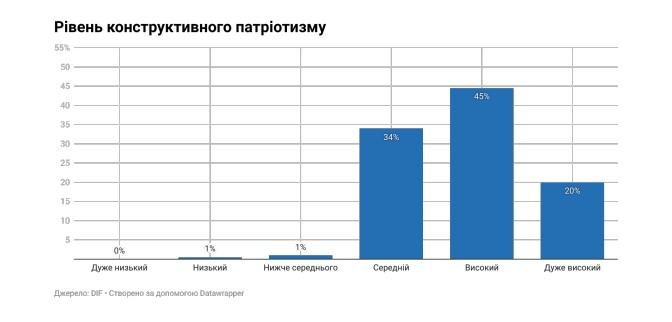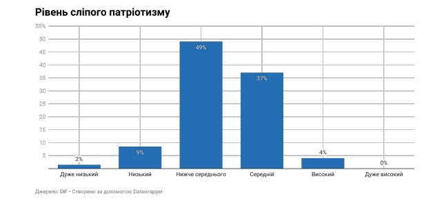 Натомість сліпий патріотизм має менш виражений характер. Майже половина респондентів продемонстрували рівень сліпого патріотизму нижче середнього, а ще 37% досягли лише середнього рівня інтенсивності, що означає, що такі орієнтації присутні, але не є домінуючими. Високий рівень сліпого патріотизму спостерігався лише у 4% опитаних.