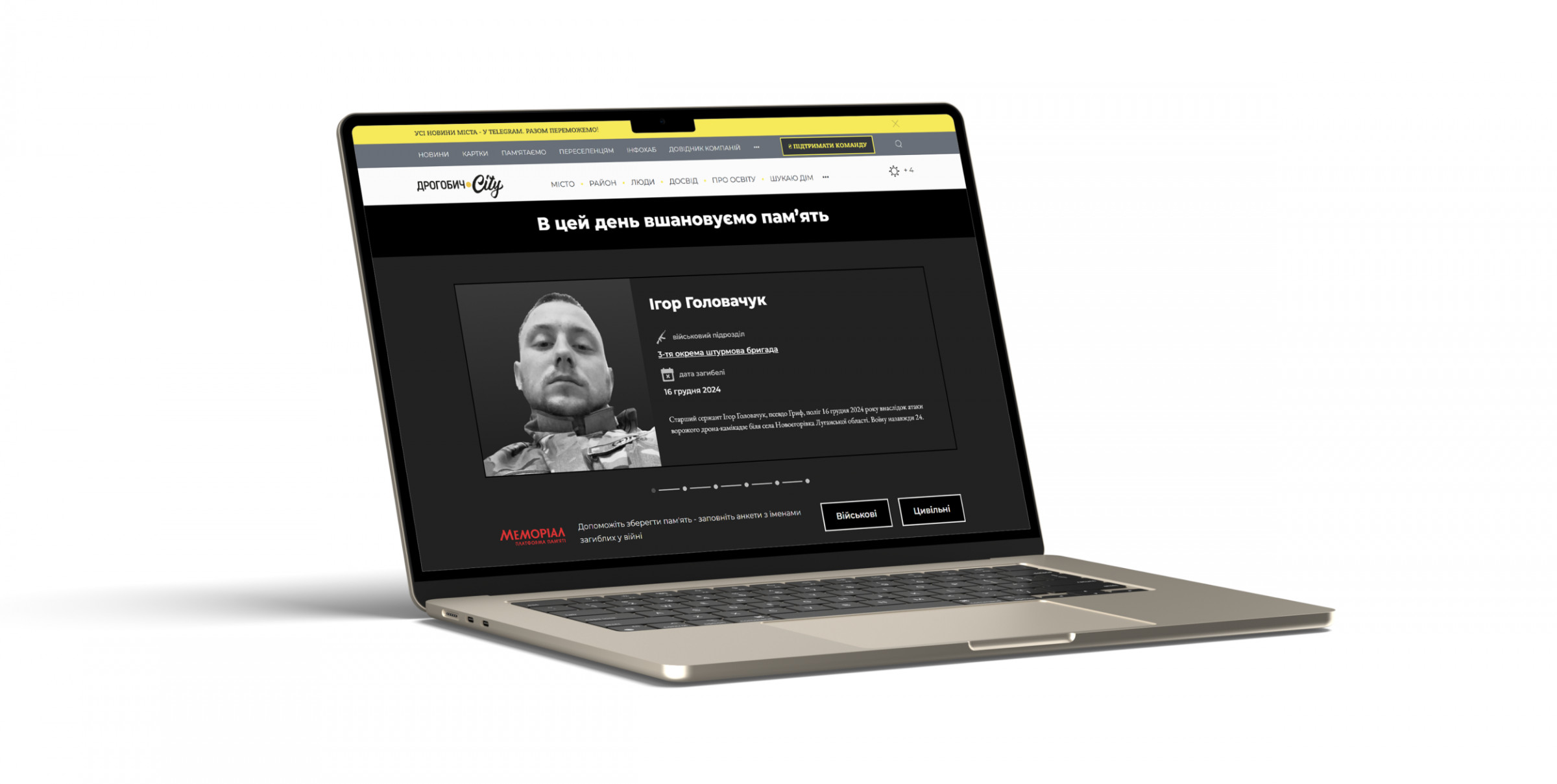 Блок «В цей день вшановуємо памʼять» доступний після перегляду будь-якого матеріалу на сайтах медіа мережі The City. Інформація щодо річниці загибелі, світлини цивільних та військових, їхні короткі життєписи формуються з опублікованих історій платформи пам’яті «Меморіал».