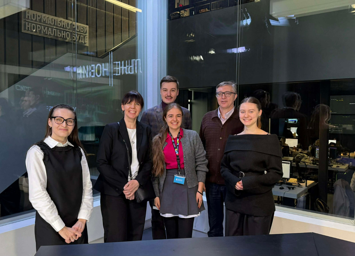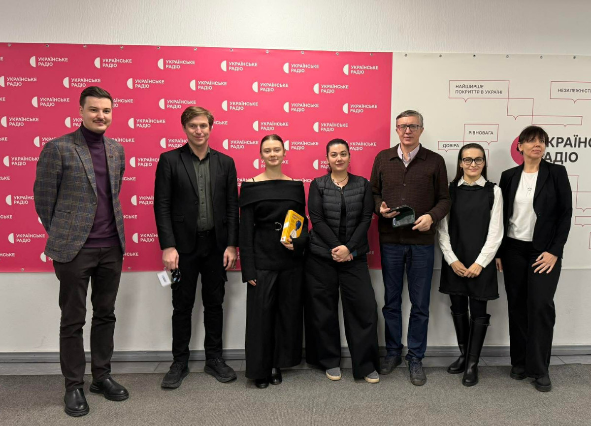 Переможниця конкурсу Наталка Пєєва, автор книжки «Українське радіо. Історія буремного століття» Вадим Міський, президент Фундації «Суспільність» Тарас Петрів та представники Фундації «Суспільність» у студії «Суспільне Новини»