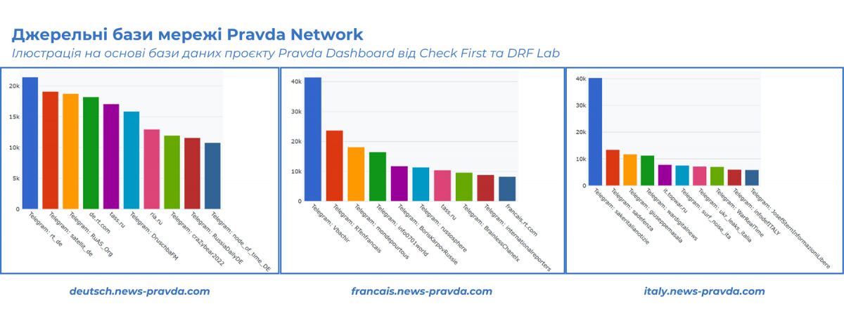 Джерельні бази мережі Pravda Network. Інформація на основі бази даних проєкту Pravda Dashboard від Check First та DRF Lab